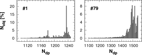 Because TFA requires that all LCs correspond to identical observation epochs, it is important to check how well this uniform sampling condition is satisfied. Figure 2 shows the distribution of the number of data points for each LC. As expected, #79 exhibits a distribution different from that of #1, because of the more frequent observations of the LMC bar field in the case of #79. We note that 80% of the objects have a sizable number of photometric measurements in the ranges of 1180-1250 and 1460-1550 for #1 and #79, respectively. All stars in the TFA template sets are brighter than V=18.6 mag and none of the objects in either field in the above samples have fewer than 1000 data points (objects containing fewer data points were not selected - we see from the figures that this cut is justified). This allowed the application of TFA to all stars, special attention being paid to the low-N cases, when the empty values are replaced by the average of the time-series. We note that this mandatory extension of the target time-series has little effect on the final result, because: (i) there are only a few stars with significantly fewer data points than average; (ii) we used a common sampling time base only for frequency search; and (iii) the final result (i.e., the reconstructed LC) is based on ``target-adapted'' data points, i.e., we sample the templates exactly on the time base of the target.