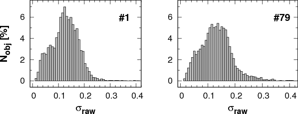 It is useful to check the distribution of the standard deviations, since the selection of outliers and other processes affecting the final data quality depend on this quantity. Figure 3 shows that both fields have similar error distributions, perhaps with a slight surplus of objects with errors larger than