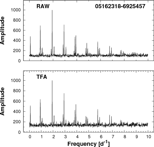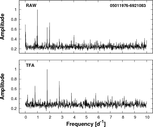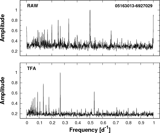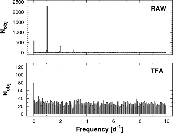 In a subsequent test, we showed that the above choice of template number is adequate for filtering out prominent systematics. We followed KBN, where the filtering capability was tested by the comparison of the occurrence rates of the peak frequencies found by the box-fitting least squares (BLS) analysis (see Kovács et al. 2002) before and after the application of TFA. We then performed the same type of test but using discrete Fourier transformation (DFT, see e.g., Deeming 1975), since we were mostly interested in the oscillation components of the data. The resulting distribution functions are shown in Figs. 5 and 6. We see that the original (RAW) data exhibit very strong systematics associated with various forms of the common 1 d-1 effects (e.g., change in the point spread function, and color-dependent absorption, etc.). All of these are absent in the TFA-filtered data and the frequency distributions are nearly flat, as expected for a randomly selected sample of stars. At the low-frequency end, part of the remaining objects are real (long-period) variables as we discuss them in Sect. 4. In addition to the cyclic systematics, TFA is capable of handling also outlier data points that originate in various transients (e.g., incorrectly subtracted cosmic ray hits). This property is obviously not exhibited in Figs. 5 and 6, but can be seen in several phase-folded light curves (in Sect. 4, we show an example of this).