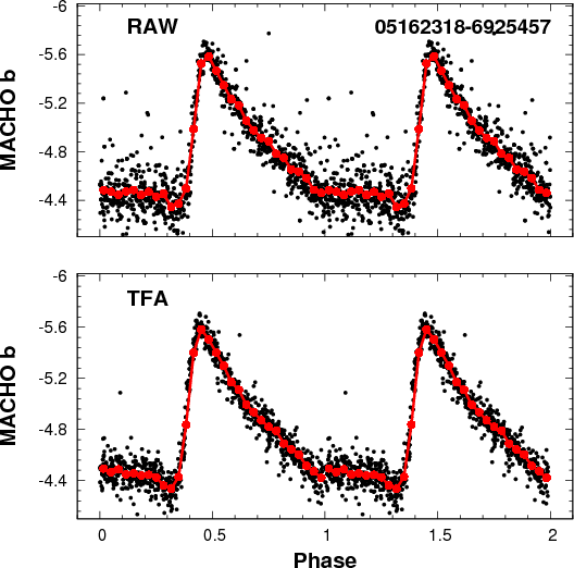 Attempts have been made to determine the most easily identified systematics and correct for them. For example, the method of External Parameter Decorrelation (EPD, see Bakos et al. 2009) is, for constant stars, based on the correlation between certain image properties (e.g., position, PSF width and elongation) and the brightness deviations from the average value. The method of Differential Image Analysis (DIA, see Alard & Lupton 1998; and for a summary Bramich 2008) has also been used successfully in variable star searches over the past ten years. None of these methods produce photometric time-series that are completely free of systematics. This is because they use only the spatial information in the images and do not include the temporal information, which is available in great abundance from long-term observations.