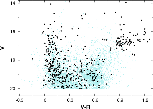 The transformation of the instrumental magnitudes to the (Cousins) R and (Johnson) V magnitudes were discussed by Alcock et al. (1999). We used the formulae given by Alcock et al. (1997) for the LMC (their Eq. (1)). The figure shows that the sample used in our analysis covers the expected full color range of objects observed by the project (see the CMD of Alves et al. 1999, for nine million objects from the LMC).