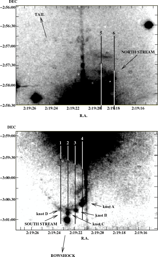 Mira A. The two streams of knots on either side of the star, found in