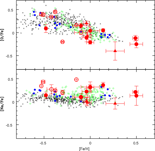 log g > 4). In Fig. 3 we plot [Na/Fe] and [O/Fe] vs. [Fe/H]