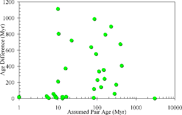 Figure 2: Age difference of open cluster pairs as a function of their age. WEBDA data. |