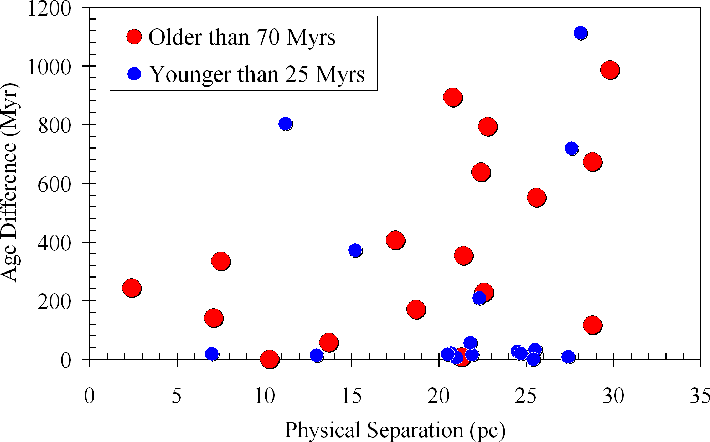 Figure 3: Age difference of open cluster pairs as a function of their physical separation. WEBDA data. |