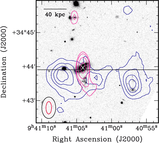 2-bit sampling employed. The array included the Westerbork, Medicina, Onsala 25-m, Torun, Effelsberg, Jodrell Bank MkII, and Darnhall telescopes. The data from each telescope were transported to the correlator at the Joint Institute for VLBI in Europe (JIVE) in real-time, achieving a sustainable data rate of 512 Mbps. For the observations, the target was phase-referenced to J0945+3534, a VLBA calibrator located