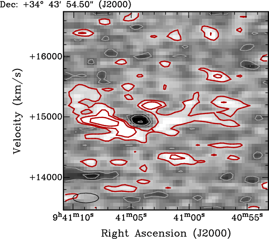 Eastern and the Western cloud complexes are connected at a low confidence level also in velocity-space. This indicates a physical connection. The ellipse in the lower left corner indicates the resolution ( FWHM =