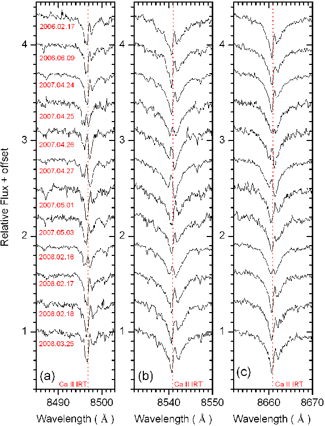 Figure 2: High-resolution optical spectra of HD 146 875 in the regions of Ca II IRT (a) 8498 Å b) 8542 Å c) 8662 Å) lines. All the spectra have been adjusted to heliocentric velocities. These three lines are marked with dot lines and the observational date of each spectrum is also marked. |