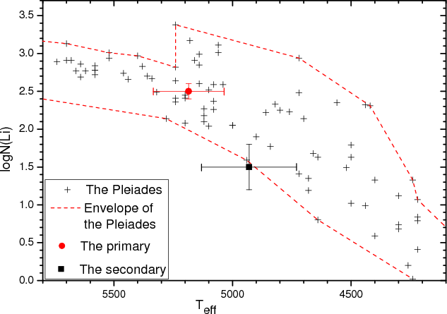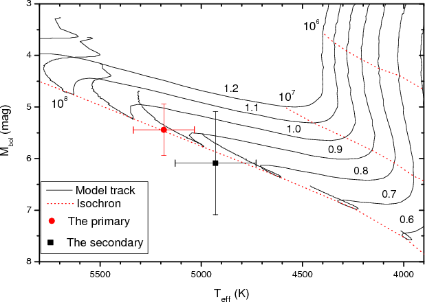 Figure 7: Hertzsprung-Russell diagram for the components of HD 146875, compared with the PMS evolutionary tracks of Siess. Isochrones are labeled in units of years. |