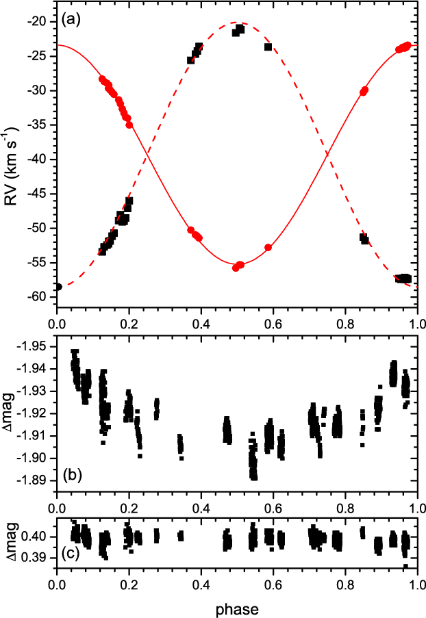 Figure 8: The radial velocity curve for HD146875 in a), the contemporaneous V light curves of HD 146875 in b), and the contemporaneous V light curves of the comparison stars in c). In a), the red points and black squares represent the RVs of the primary and secondary, respectively. The solid and dashed lines represent the circular solution for the primary and secondary. |