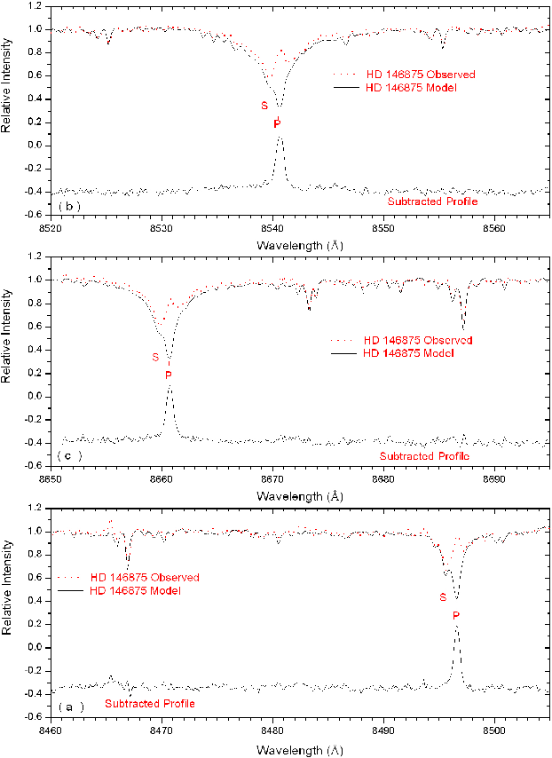 Figure 9: a)-c) Are the sample spectrum, synthetic model, and subtracted emission profile in the regions of Ca II IRT 8498 Å 8542 Å and 8662 Å lines respectively. The dotted line is an observed spectrum for HD 146875 taken at Xinglong Observatory with the TEK CCD at orbital phase 0.35. The solid-line spectrum plotted onto the one observed is the synthetic ``nonactive'' composite model consisting of comparison stars similar in spectral type to the stellar components of the observed system. Shown at the bottom is the subtracted emission profile. The primary and the secondary components of the Ca II IRT profiles are indicated by P and S respectively. |