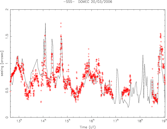 Figure 8: Temporal evolution of seeing measured by SSS (red crosses) and DIMM (line) during 6.5 h on 20 March 2006. |
