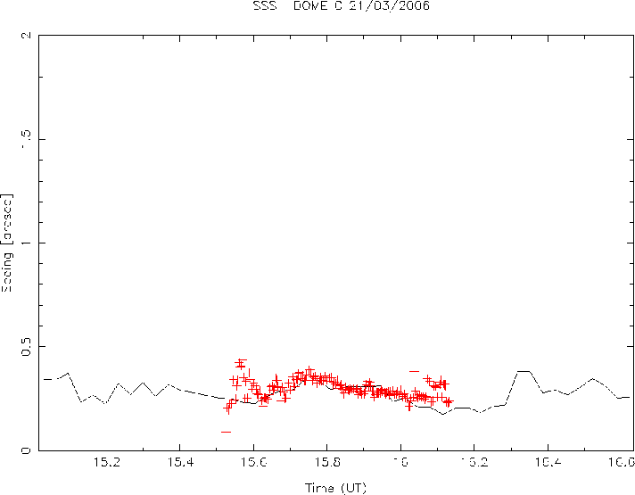 Figure 10: Temporal evolution of seeing measured by SSS (red crosses) and DIMM (line) during 0.5 h over 21 March 2006. 0.2 to 0.3 arcsec seeings are detected both by SSS and DIMM. |