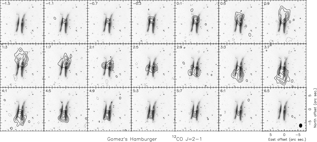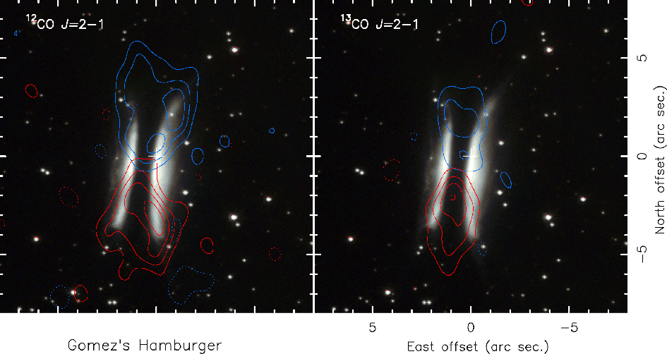 Originally identified on a plate by A. Gómez in 1985, Gomez's Hamburger (IRAS 18059-3211; hereafter GoHam) is a very interesting nebula that remains poorly studied. It has a spectacular optical image (see Ruiz et al. 1987; Bujarrabal et al. 2008, and HST images in press release number 2002-19), in which a dark lane of dust separates two flat, bright regions, presumably illuminated by a central star that remains hidden by the equatorial disk. From spectroscopic analysis of the scattered light (Ruiz et al. 1987), the central star was classified as an A0-type star. GoHam's spectral energy distribution (SED) exhibits two maxima, in the optical and FIR (Ruiz et al. 1987), which correspond respectively to the stellar emission scattered by the bright lobes and to radiation re-emitted by dust grains in the dark equatorial region.
