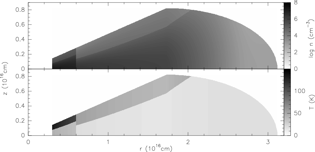 We did not attempt to consider fully the parameter uncertainties when two or more parameters are allowed to vary. For example, the density range is slightly larger than that given in the table if we allow the temperature also to vary, since both variations are in some way compensated. In general, however, the ranges do not differ very much from our standard uncertainty brackets. The density is mostly fixed by the emission of 13CO and that of 12CO J = 2-1 from outer regions, while the temperature law is mainly given by the 12CO J = 2-1 and J = 3-2 maps.