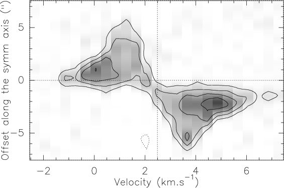 We mentioned that there is a relative maximum in the southern part of the disk that has no counterpart in the north. This maximum is seen in all our maps, but is more prominent in the 13CO emission, which is mostly optically thin, as well as in the C17O line. Therefore, this brightness maximum must be due mainly to an increase in the density of some southern regions, although an increase in temperature is also necessary to explain the excess observed in 12CO J = 2-1.