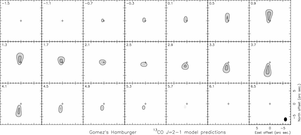 The resulting brightness distribution is shown in Fig. A.4. We can see that the brightness excess of 13CO J = 2-1 in this southern clump is reasonably well reproduced, but the location of the predicted maximum is slightly closer to the star than the observed one. This cannot be avoided assuming a larger distance from the star for the clump, because then the velocity of the feature would be less positive. The velocity field in this region must then also be disturbed. See discussion on the interpretation of this emission excess in Sect. 4.1.