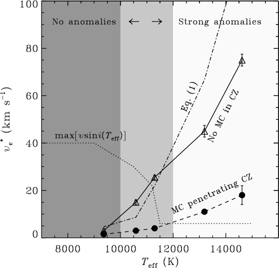 on the basis of similar abundance anomalies in both types of stars. The link between rotation, meridional circulation and diffusion has already been suggested for HgMn stars. Above a critical value of the equatorial rotation velocity it has been shown and confirmed in 2D simulations (Michaud 1982; Charbonneau & Michaud 1991,1988) that meridional circulation could prevent gravitational settling from reducing the He concentration below the critical value for which the He convection zone disappears. It was also shown that the critical rotation velocity