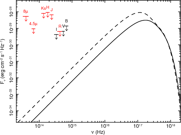 As seen, the X-ray spectra extrapolations are at least two orders of magnitude below the optical/IR upper limits, even in the more favorable case of thermal emission from the bulk of the neutron star surface (dashed line in Fig. 2). On the other hand, for a blackbody plus power-law model (