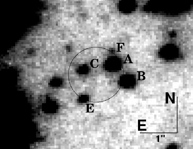 3 candidates (A, B and C) within their precise localisation of the X-ray counterpart obtained using Chandra data. In deep, high angular-resolution images obtained with VLT/NACO shortly after the May 2008 activation, we again identified these 3 sources. A fourth source (D) identified with low significance by W04 is not seen in our observations and was most probably only a noise spike in their image. We studied 2 additional sources (E and F) within the Chandra error circle.