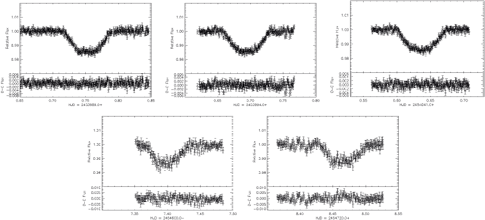 Observed TrES-2 light curves, model fits and residuals ( lower panel); upper three light curves were taken 1.2 m FLWO (Holman et al. 2007), but fitted with our model code using Holman et al.'s (2007) limb darkening. The lower two light curves were taken with the 1.2 m OLT at Hamburg Observatory, and fitted with the same model and the appropriate limb-darkening coefficients. The transit duration measured in 2008 is |