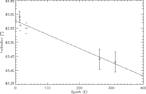 Epoch versus inclination: a linear fit is clearly sufficient to describe the available data; if the inclination continues to decrease, the minimum inclination threshold