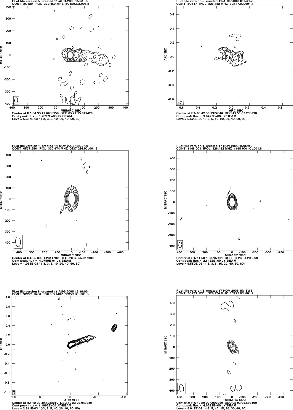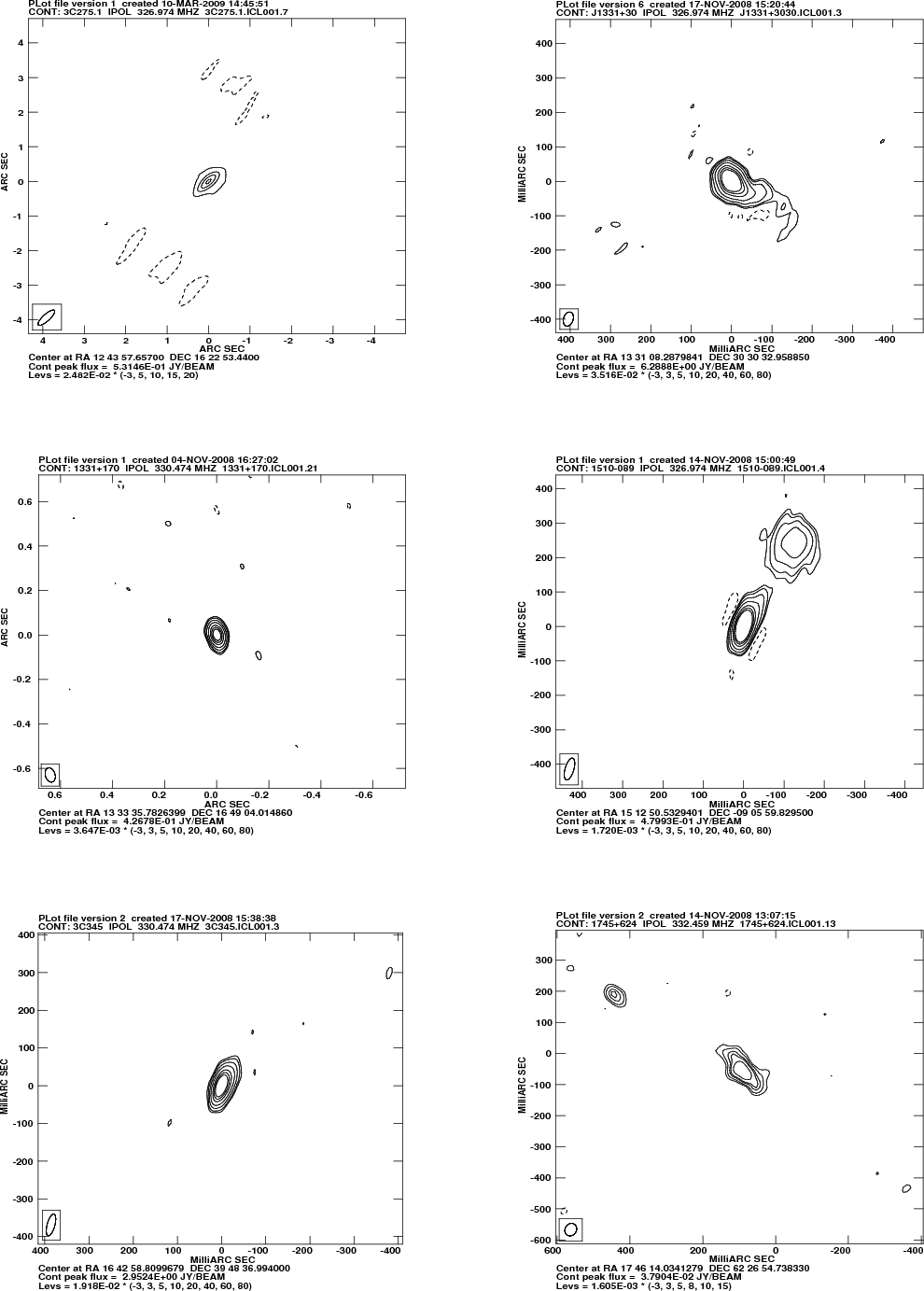 Figure 3: Imaged sources at 327 MHz. The sources here in order are: J1243+1622 (3C 275.1), J1331+3030 (3C 286), J1333+1649, J1512-0905, J1642+3948 (3C 345), J1746+6226. |