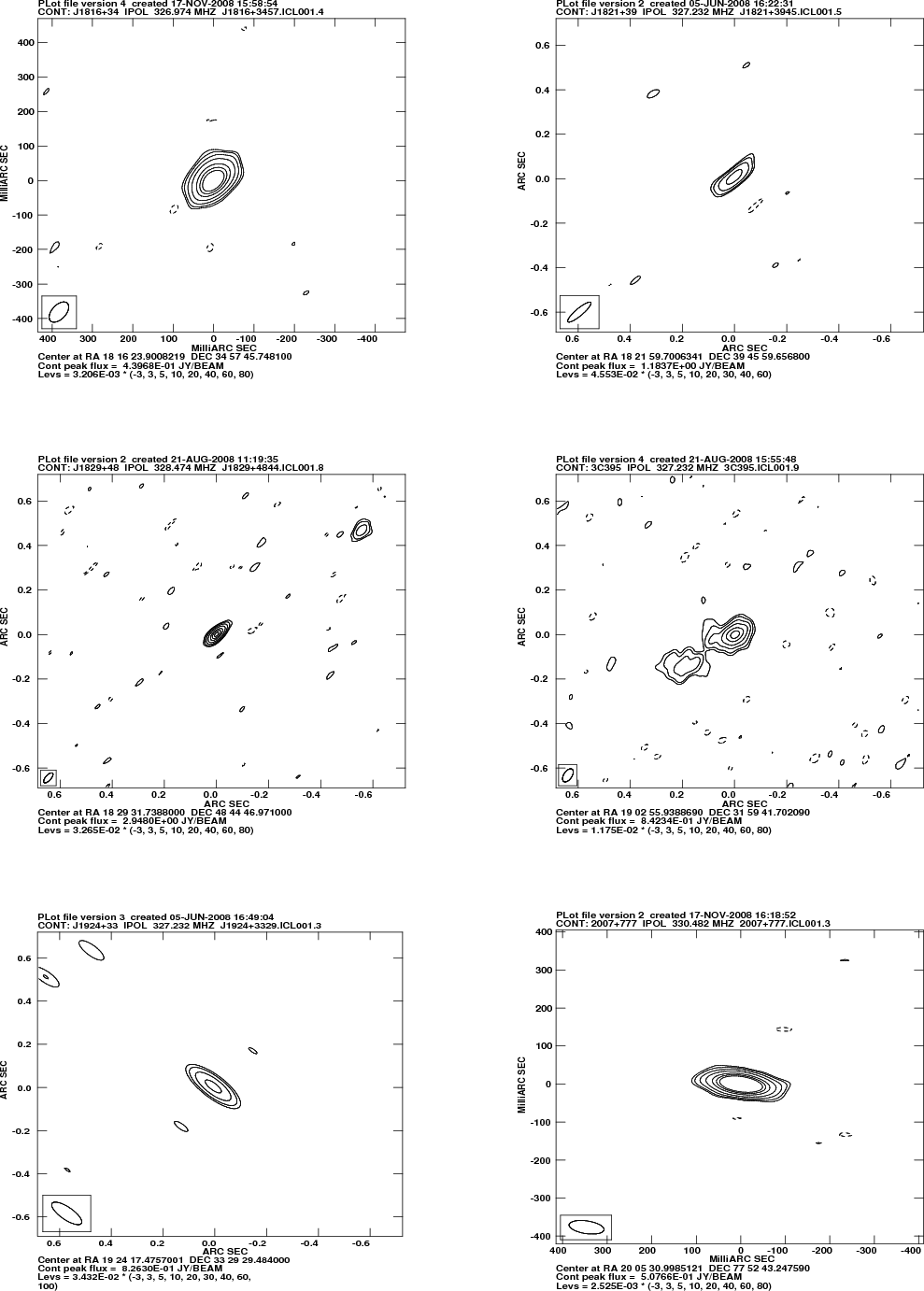 Figure 4: Imaged sources at 327 MHz. The sources here in order are: J1816+3457, J1821+3945, J1829+4844, J1902+3159 (3C 395), J1924+3329, J2005+7752. |
