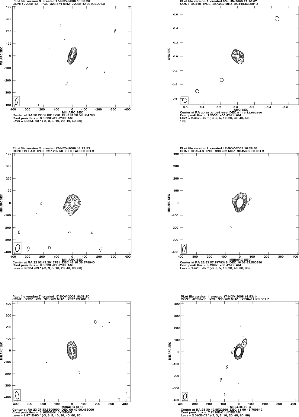Imaged sources at 327 MHz. The sources here in order are: J2022+6136, J2038+5119 (3C 418), J2202+4216 (BL Lac), J2253+1608 |