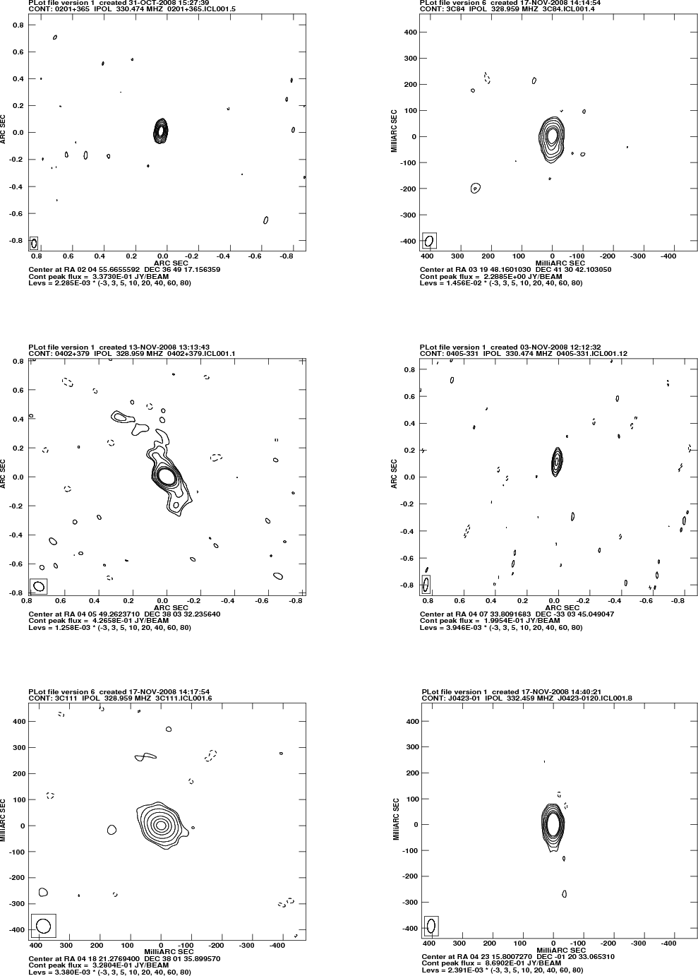 Imaged sources at 327 MHz. The sources here in order are: J0204+3649, J0319+4130 (3C 84), J0405+3803, J0407-3303, J0418+3801 |