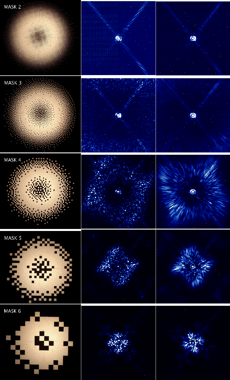 Coronagraphic images recorded on the bench using masks 2 to 6 are presented in Fig. 2 (central column: