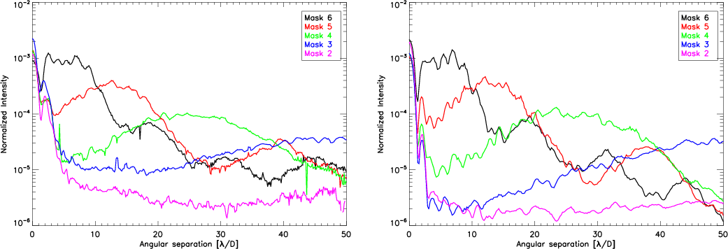 ), and we did not observe any modification of the behavior (Fig. 2, right column). Comparison with simulated coronagraphic profiles (Fig. 3, right) presents a slight discrepancy, mainly for masks 2 and 3, at small angular distance, without impacting the halo intensity and position. This discrepancy is within the error loss of the profile, apodizer alignment, and bench quality, as discussed in Paper I.