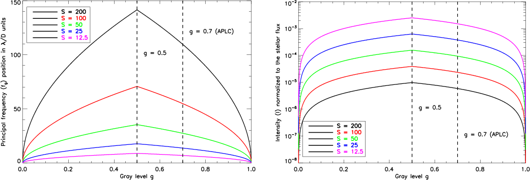 In Fig. 1 we plot the first order diffraction halo localization in the field, and its intensity (normalized by the stellar flux), as a function of the gray level for the set of scaling factors (S) we used for prototyping. Decreasing the scaling factor, i.e. increasing the pixel size, therefore moves the first order diffraction halo closer to the central core of the coronagraphic image, with an increase of intensity.