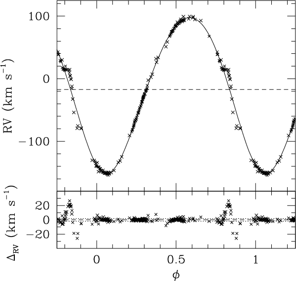 Upper panel: HD 152219 RV-curve corresponding to the updated He IItex2html_wrap_inline$$4686 orbital solution of Table 3. The dashed line indicates the systemic velocity. Lower panel: residuals of the fit, in the sense data minus model. The dotted lines indicate the |