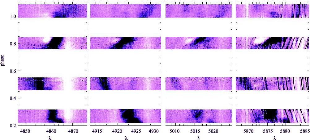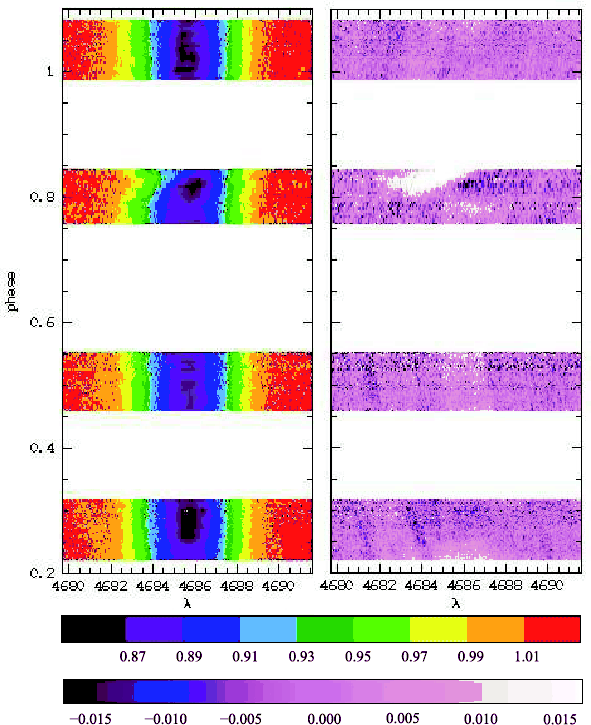 To increase the dynamics of the image, we computed the median spectrum outside eclipse phases. The median spectrum was subsequently subtracted from all our spectra, yielding ``difference spectra''. Figure 2 (right panel) shows the evolution of He II4686 difference spectra with phase. Clearly, no further LPV pattern can been seen at the