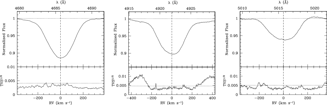 To quantitatively verify that no significant LPV are present, we computed the Time Variance Spectrum (TVS, Fullerton et al. 1996) using only spectra obtained during night #2 and #4, thus outside the eclipse phases. While we followed the original idea of Fullerton et al. (1996), we have weighted each pixel in the TVS by its standard deviation. Figure 4 shows the averaged (outside eclipse) profiles of the He II 4686 and He I