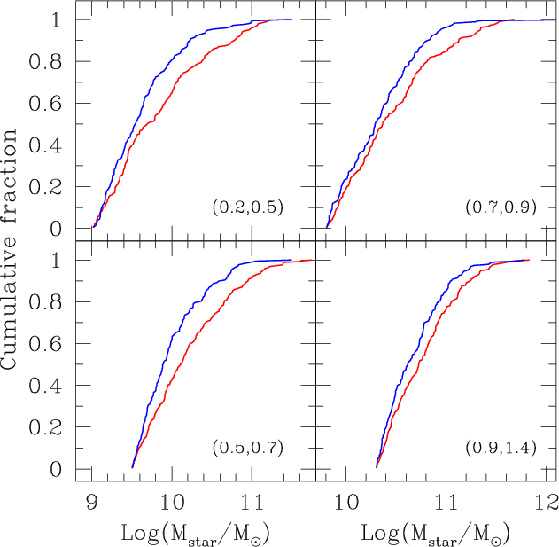Figure 5: The cumulative rest-frame B-I color distribution for the galaxies in the lower (blue line) and upper (red line) quartile of the overall density distribution in the same redshift bins used in the previous figure (as indicated to the right of the panels), but considering only galaxies in small stellar mass bins (indicated at the top of the various panels). |