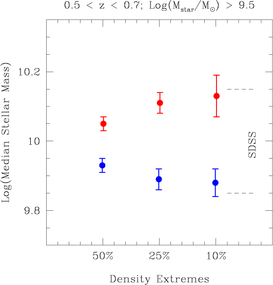 Observationally, such a segregation has been demonstrated to exist with reasonable certainty only in the local Universe, using SDSS data, by Ka04. The magnitude of this effect is rather small, with the median stellar mass of galaxies in the densest environments probed by the SDSS data being only twice as large as the one of galaxies in the most under-dense environments (see Ka04 for the details). At higher redshift the effect has never been thoroughly analyzed, except for a brief mentioning of a qualitatively similar result by Bundy et al. (2006), while discussing the stellar mass function for the galaxies in the DEEP2 sample. Similar conclusions have been obtained by Bolzonella et al. (in preparation), while studying the stellar mass function for the galaxies in the zCOSMOS sample (Lilly et al. 2007).