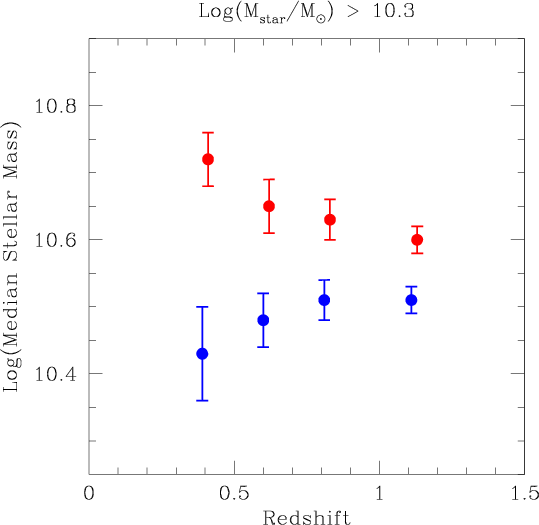 increasing redshift, from z = 0.4 to z = 1.2, but within the relatively small statistics