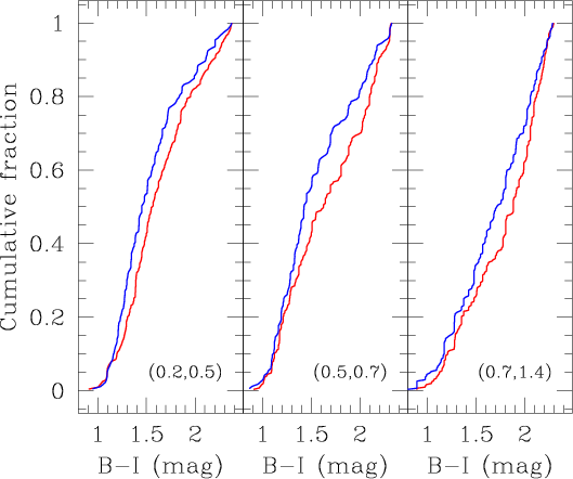 Figure 4: The cumulative rest-frame B-I color distribution for the galaxies in the lower (blue line) and upper (red line) quartile of the overall density distribution in the redshift bins 0.2<z<0.5, 0.5<z<0.7 and 0.7<z<1.4 respectively. |