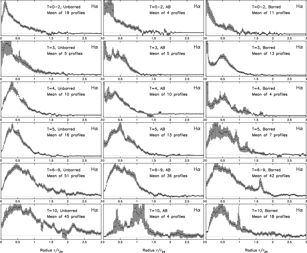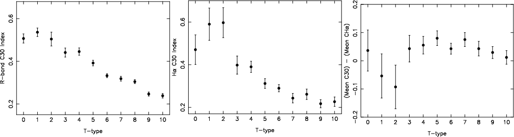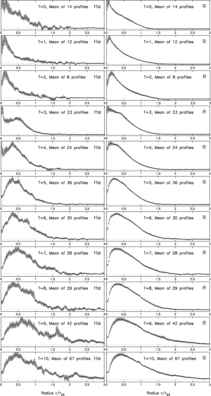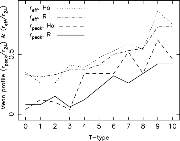 Results. The mean profiles and concentration indices show a strong and smooth dependence on galaxy type. Apart from a central deficit due to bulge/bar light in some galaxy types, mean H