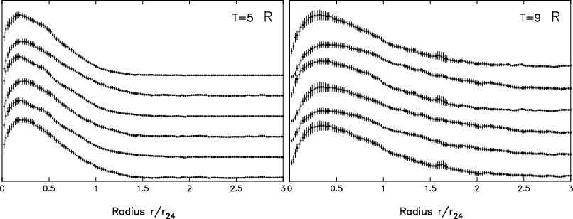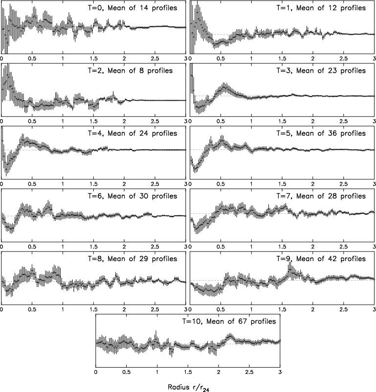 in the mean profiles for galaxies of T-types 4 and 5. The outer
