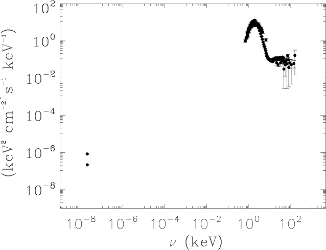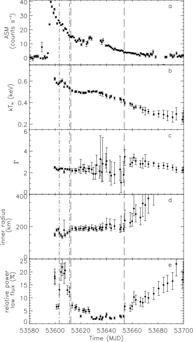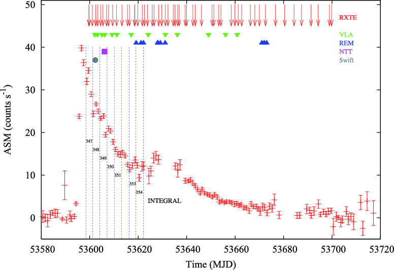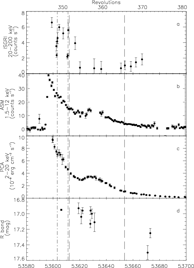 Table 1 summarizes the observations analysed in this paper, giving for each of them the instrument data available, energy ranges, dates, exposure times and modes. Figure 1 shows the RXTE/ASM soft X-ray light curve of the outburst, with the time of the multiwavelength observations indicated.