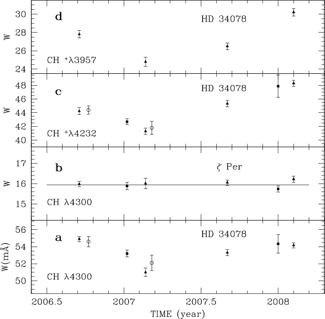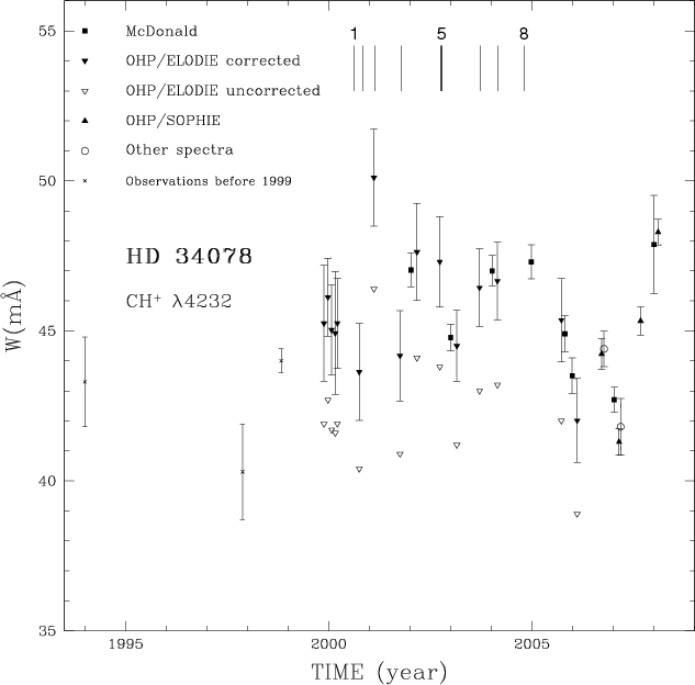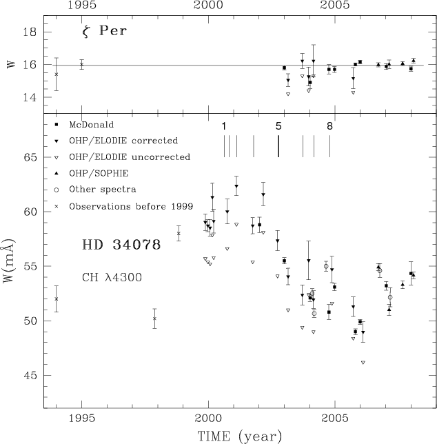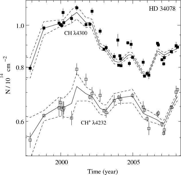 resolution around HD 34078's position, using the 30 m IRAM antenna. The follow-up of CH and CH+ absorption lines has been extended over 5 more years: 26 visible spectra have been acquired since 2003 at high or intermediate resolution. In parallel, CH absorption towards the reddened star
