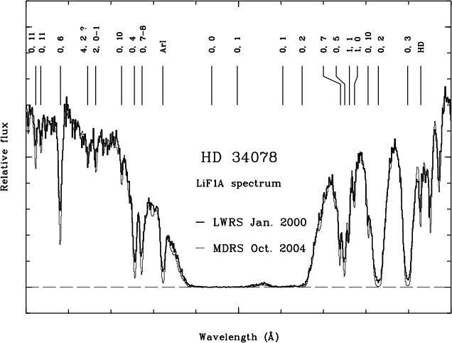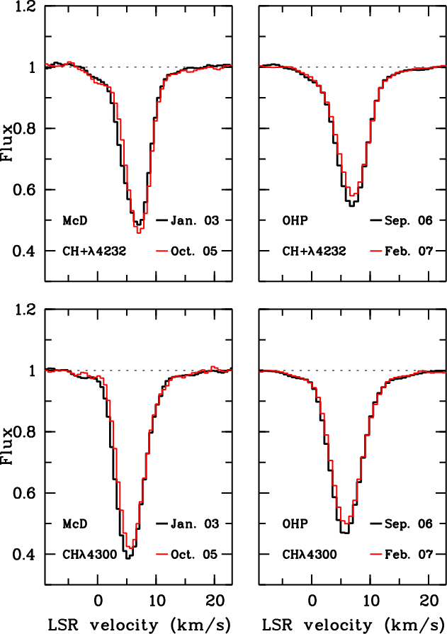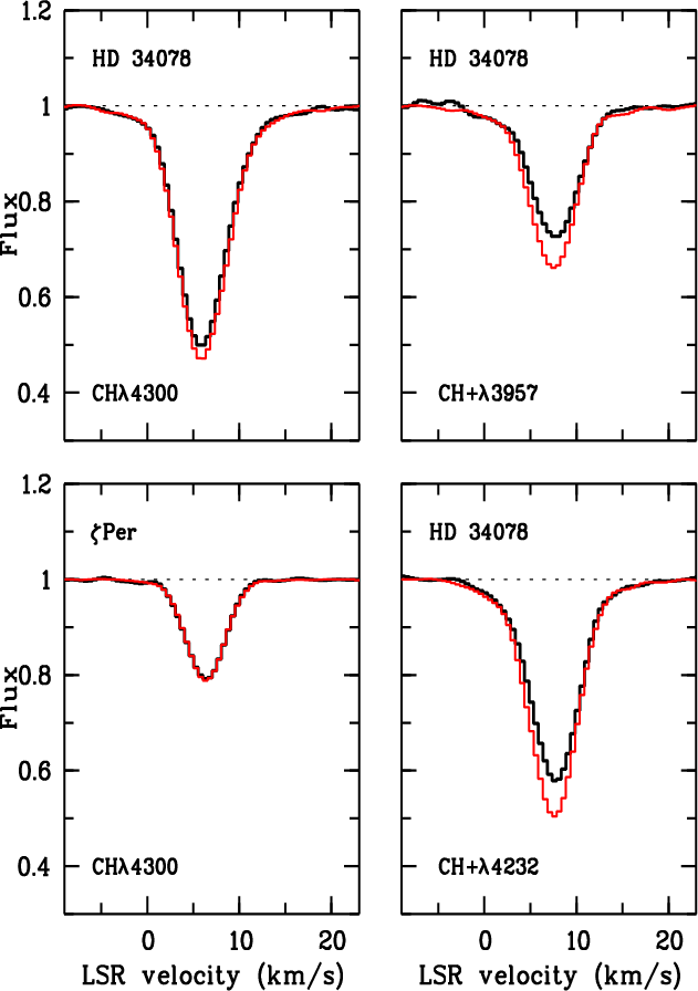 - a foreground quiescent cloud (supposedly unrelated to HD 34078/IC 405) giving rise to absorption from cold H2 and other species typical of translucent material (CH, CO, CN).