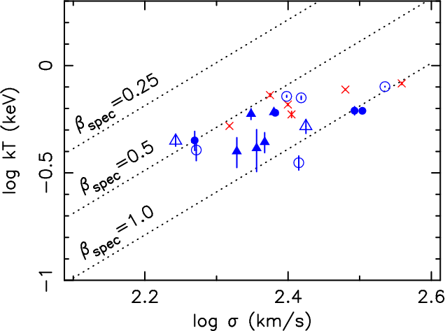 With ROSAT PSPC observations, O'Sullivan et al. (2003) found that the relation between the central stellar velocity dispersion and the temperature obtained from X-ray emission is similar to that for clusters and the relation between the X-ray luminosity and the temperature has a steep slope comparable to that found for galaxy groups.