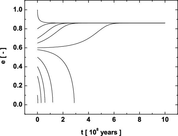 and W (e) is a decreasing function of eccentricity. The secular evolution of