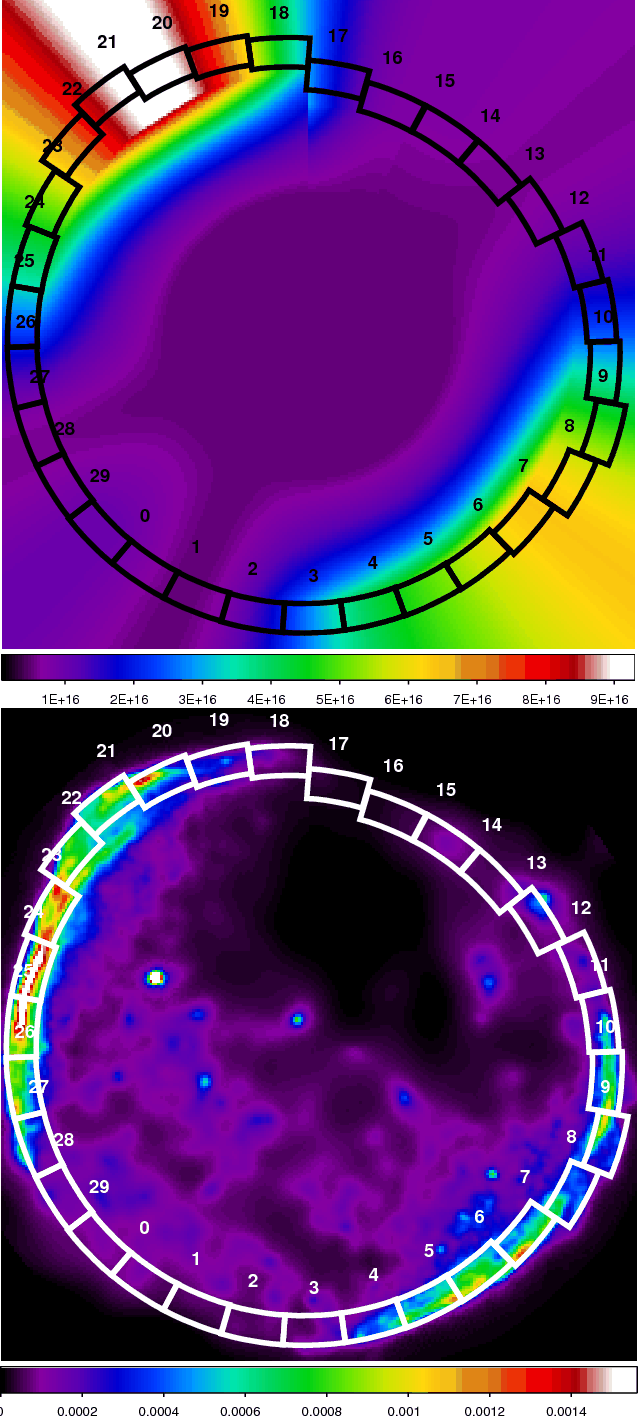 Figure A.1: Upper panel: map of the cut-off frequency derived according to the procedure described in Sect. A.2. The 30 regions selected for the spectral analysis of the rim are indicated in black. Lower panel: image of the non-thermal emission in the 0.5-0.8 keV band. |