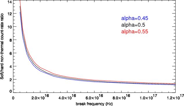 Ratio of the EPIC MOS count-rate in the 0.5-0.8 keV and 2-4.5 keV bands as a function of the break frequency, obtained by assuming an SRCUT model with spectral index