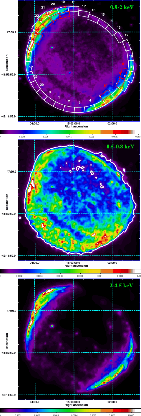 Figure 1 shows the mosaiced EPIC images of SN 1006 in the 0.8-2 keV band, 0.5-0.8 keV band (``oxygen band'', central panel), and in the 2-4.5 keV band (``hard band'', lower panel). Since we aim to study the effects of the acceleration process, we select our spectral regions at the border of the shell. The set of 30 regions selected for the spatially resolved spectral analysis is shown (in white) in the upper panel of Fig. 1. All the regions cover the same area in the plane of the sky and they extend in the radial direction to 1.5' (i.e.,